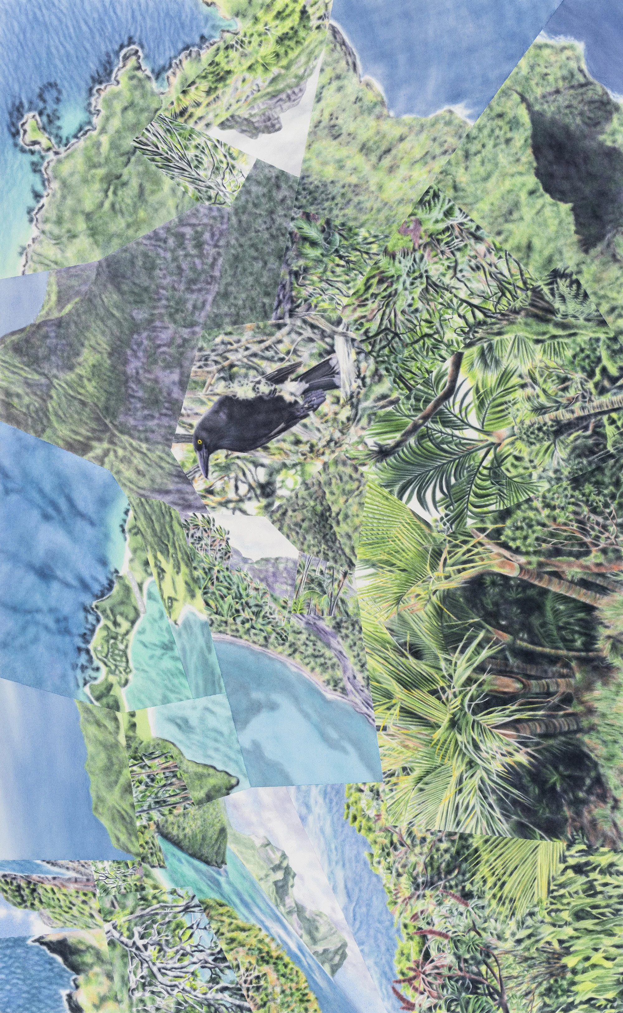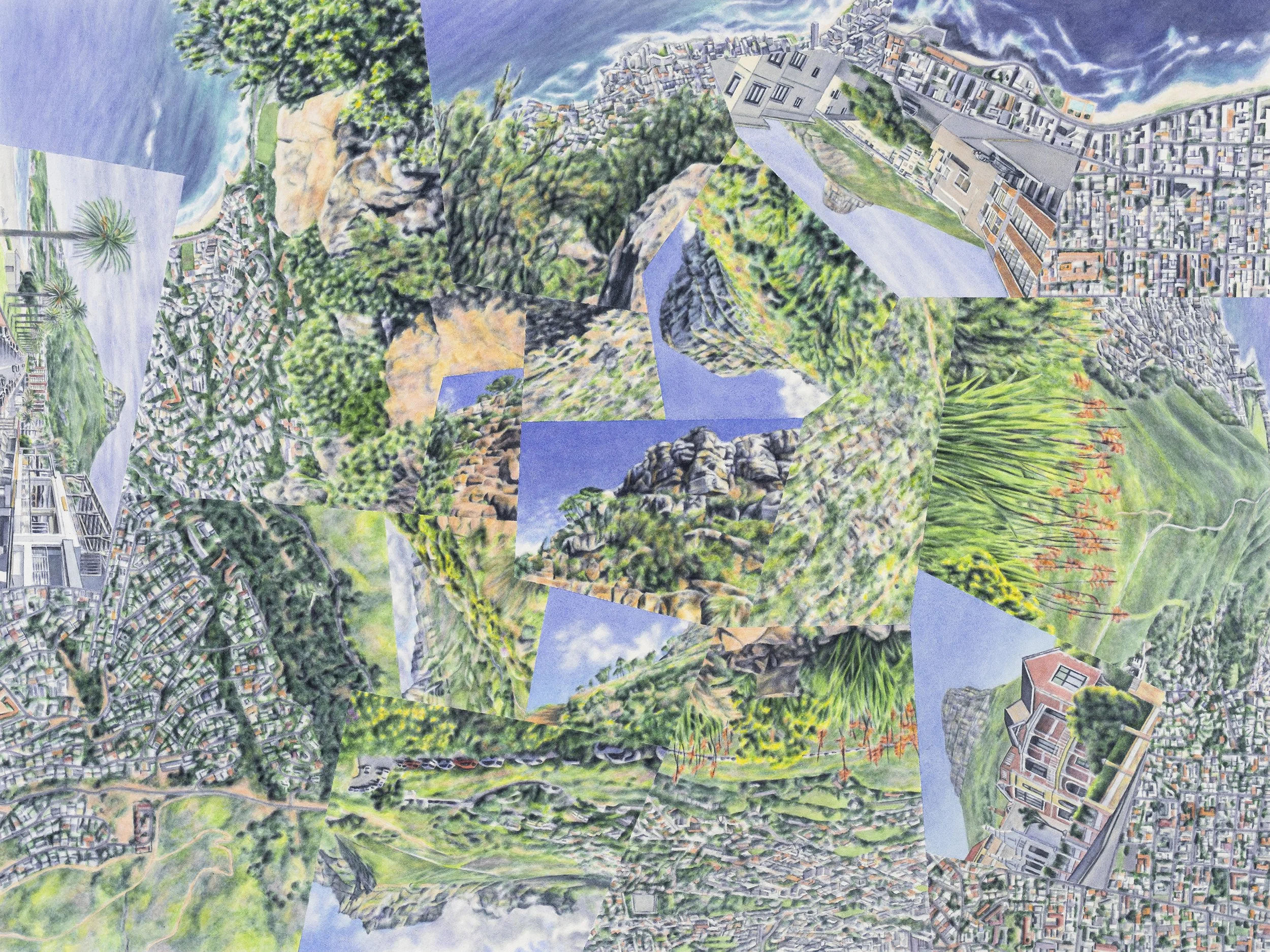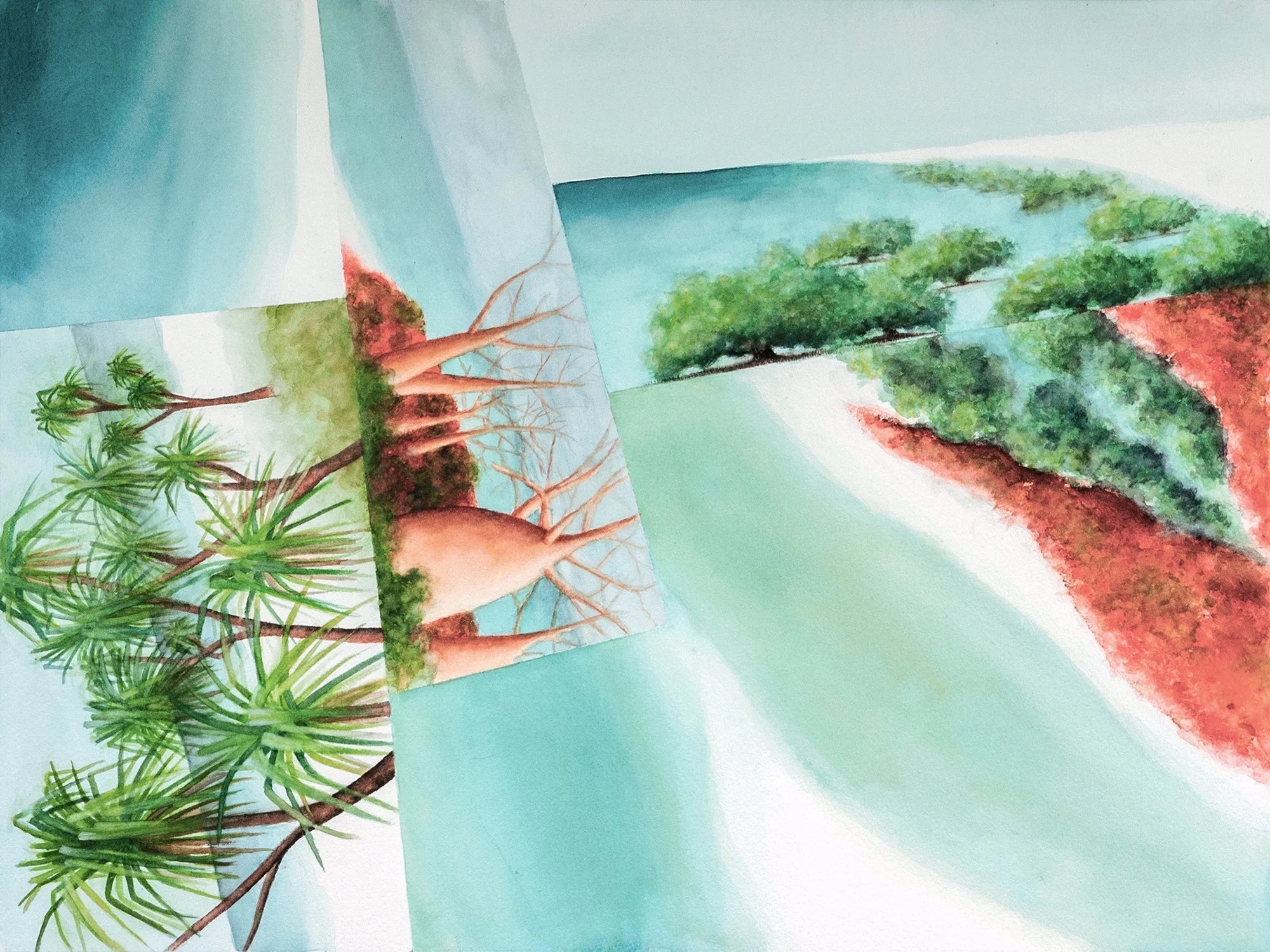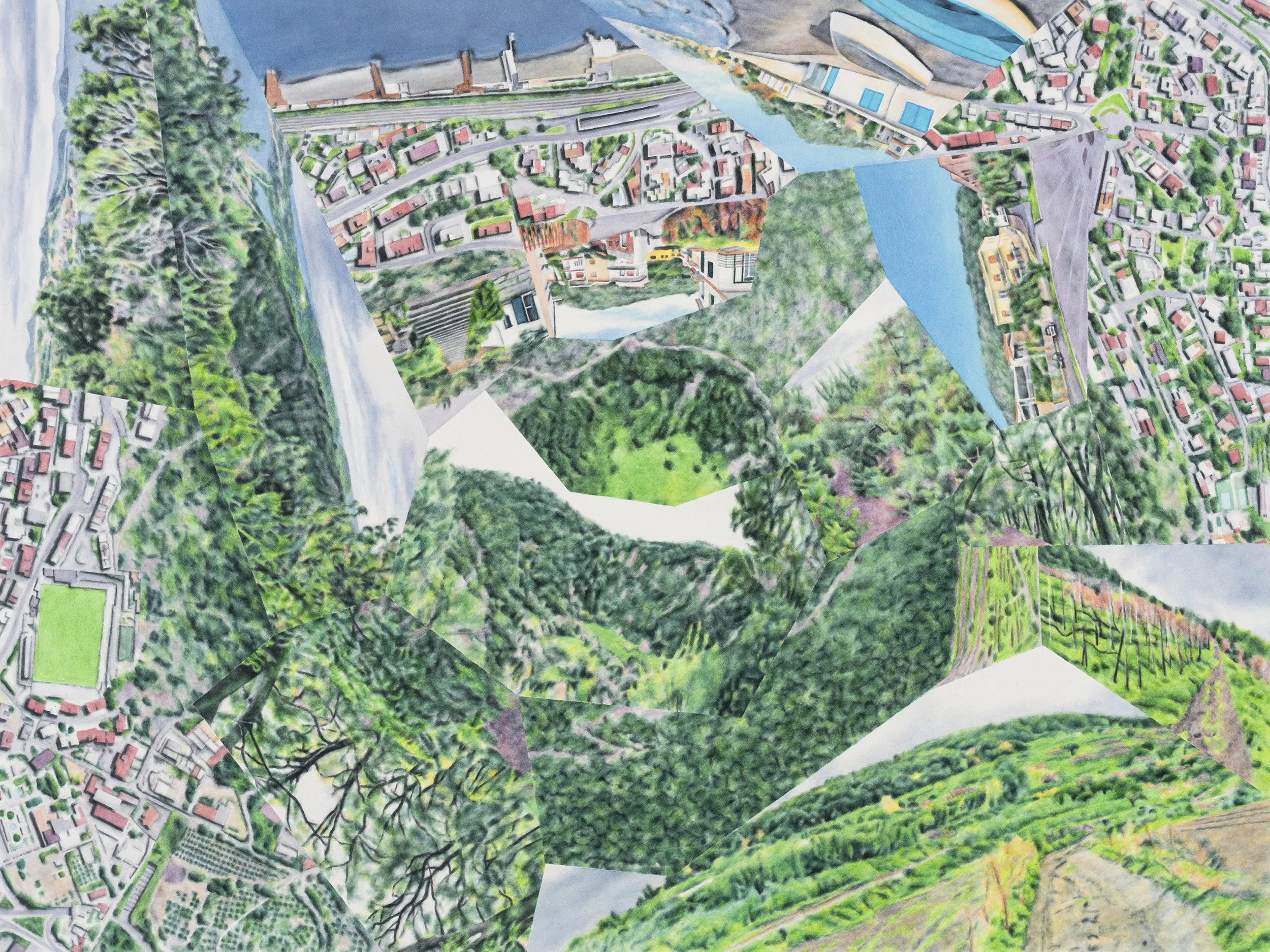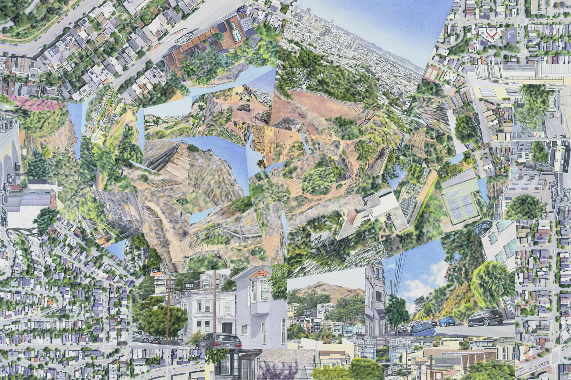 The multifaceted style of these works evolved from photomontages merging fragments of travel photographs. Most of the oil paintings are direct reinterpretations of those digital compositions; the individual ground-level views are informed almost exclusively by my own photography in all of the oil and watercolor works.